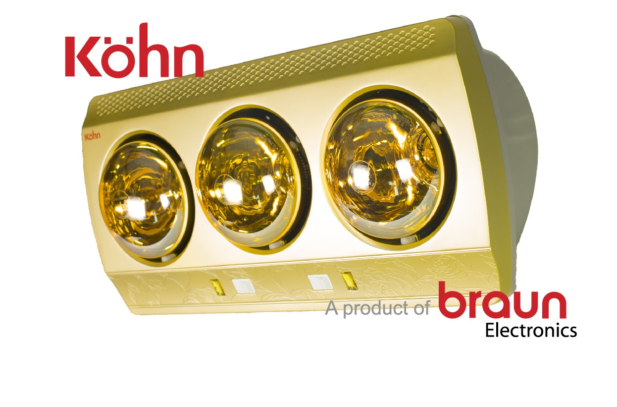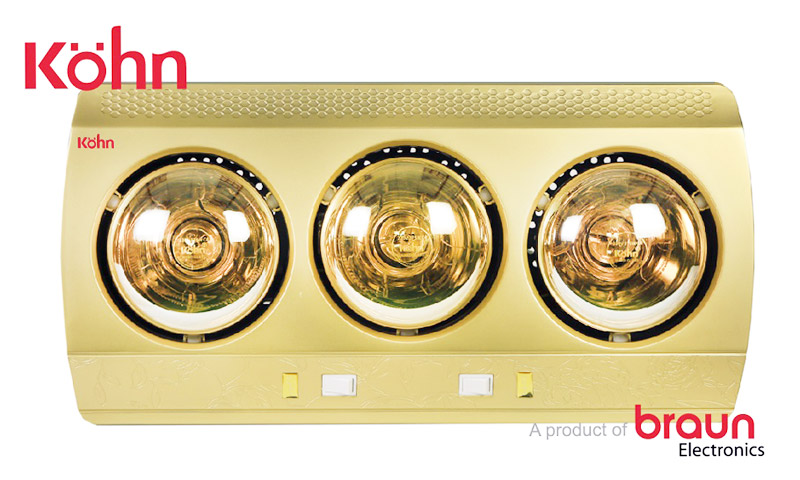 - Đèn sưởi nhà tắm kohn của hãng Braun(KN03G) sản xuất và lắp ráp tại CHLB Đức mang trong mình kiểu dáng sang trọng theo phong cách châu Âu với hình dáng chữ nhật bo tròn 2 bên viền vàng ánh kim điểm lên nhưng bông hoa khiến đèn sưởi nhà tắm Kohn 3 bóng vàng mang theo hơi hướm dịu dàng thoải mái và viền trắng làm nổi bật sản phẩm trong tầm mắt của người dùng đem lại sự ấm áp và an toàn trong phòng tắm.