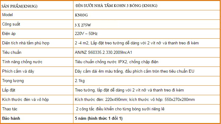 - Hơn thế với sản phẩm đèn sưởi nhà tắm Kohn 3 bóng vàng(KN03G) còn được hãng bảo hành tận 5 năm lỗi 1 đổi 1 đã một phần nào cho người tiêu dùng thấy được nhà sản xuất rất tự tin đến sản phẩm của mình giúp khách hàng an tâm sử dụng.